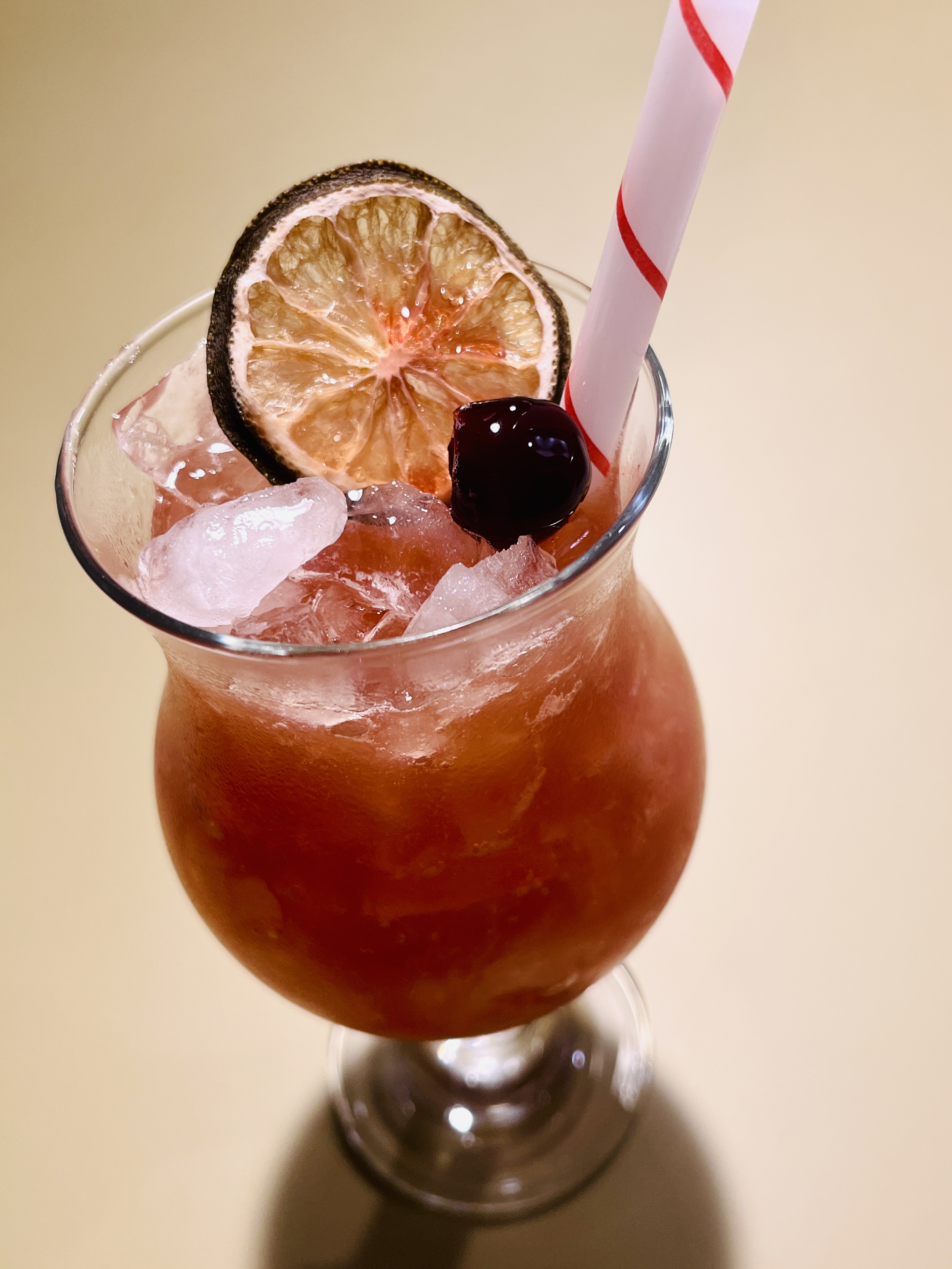 Combine all liquid ingredients in a shaker filled with ice. Shake until chilled, then strain into a hurricane glass filled with crushed ice. Garnish with lime and cherry.