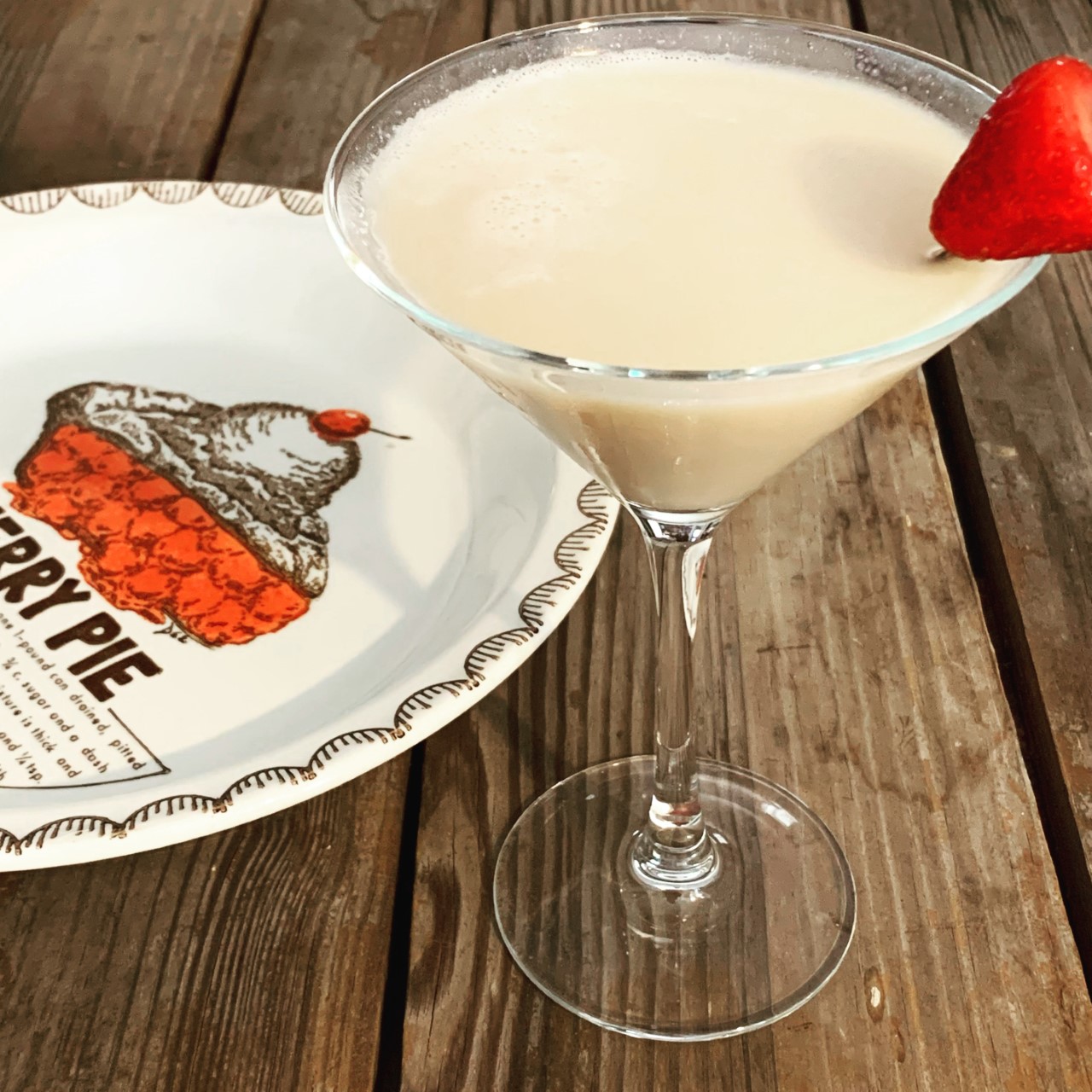 Combine all liquid ingredients in a shaker with ice. Shake until chilled, then strain into a martini glass. Garnish with a strawberry.