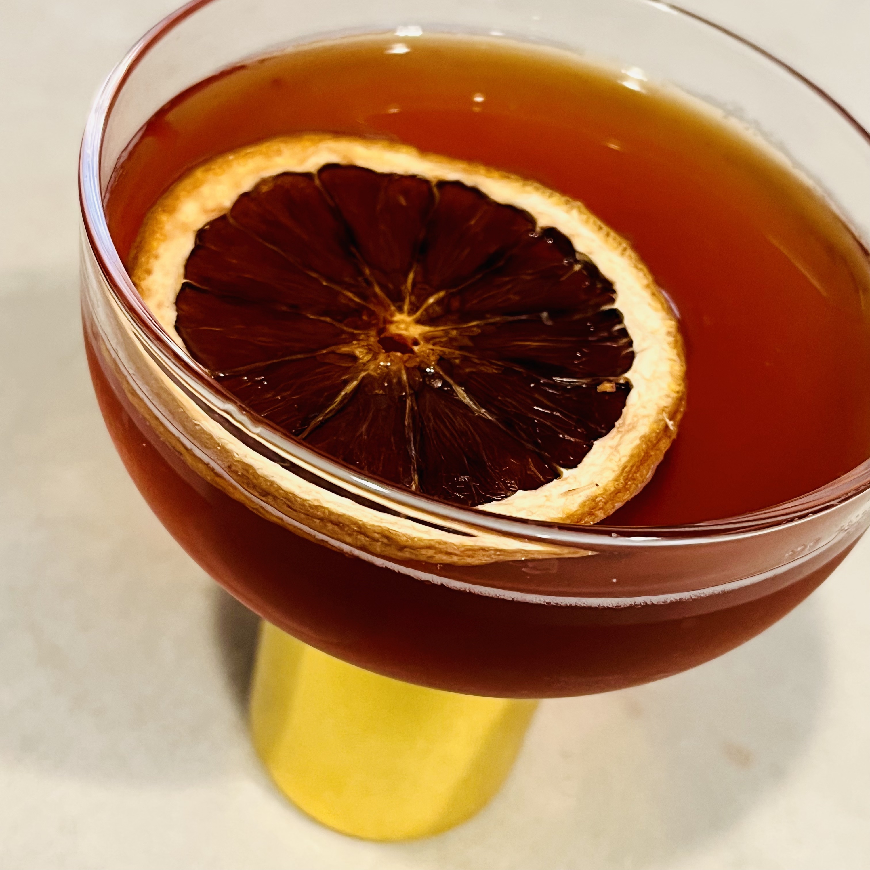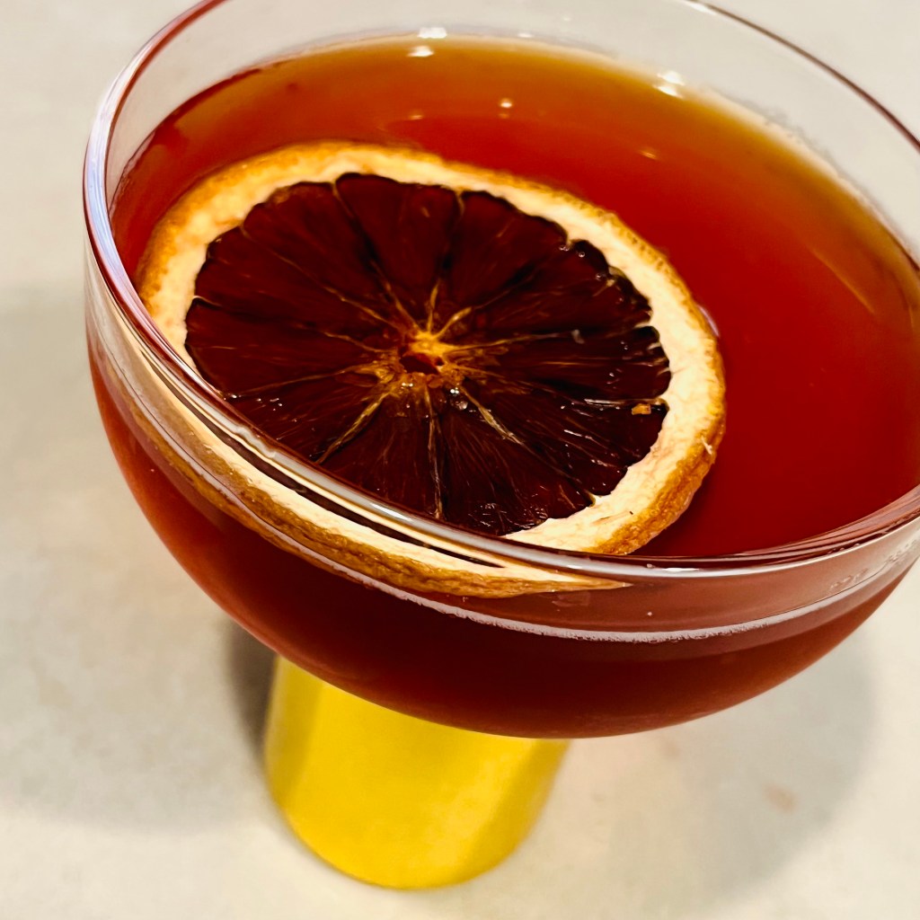 Combine all ingredients in a shaker with ice. Shake until chilled, then strain into a glass. Flame an orange peel over the top to release the oils, then garnish with a dried blood orange slice.