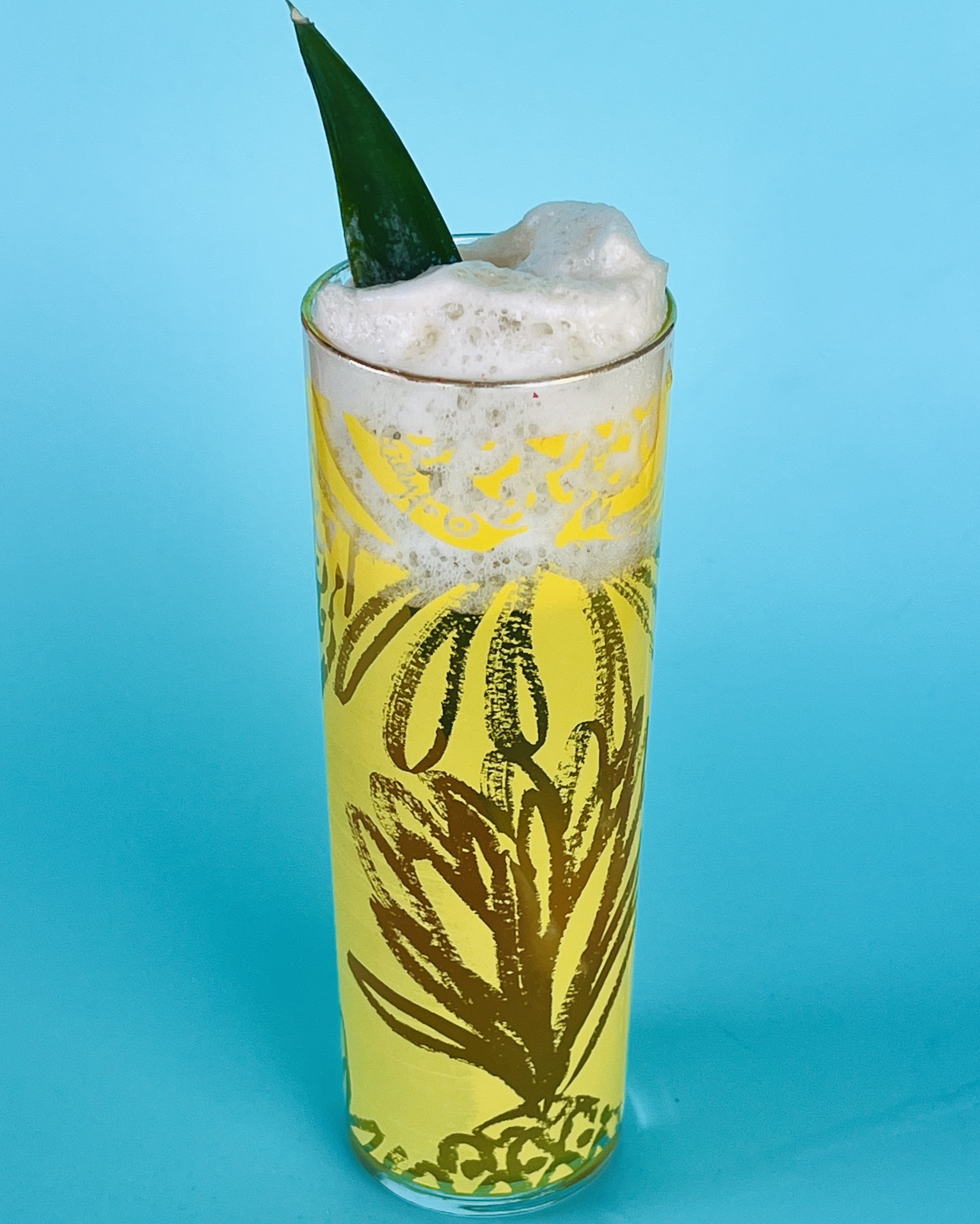 Add all ingredients except tonic water to a shaker. Shake vigorously until combined and frothy, then add ice. Shake again until chilled. Pour three ounces of tonic water into a Collins glass, then strain the contents of the shaker into the glass. Top with the rest of the tonic water, until the mixture foams up just past the rim of the glass. Garnish with a pineapple leaf (optional).