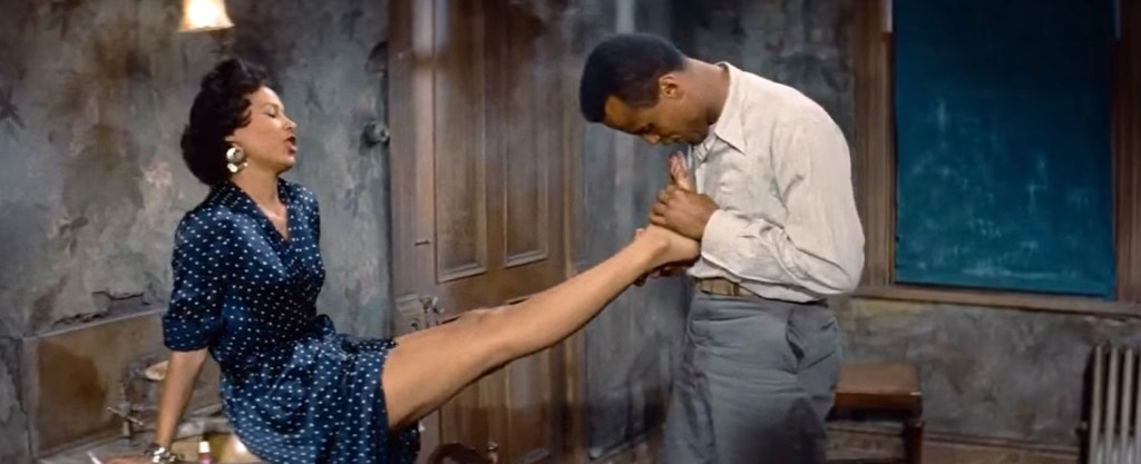 I’ve long been a fan of Harry Belafonte’s “Calypso” album, so don’t get me started about what a disappointment it was that his Carmen Jones singing voice was dubbed. In an alternate universe, he and Dorothy Dandridge put out a normal, non-operatic soundtrack album that matched the tone and setting of the film, and that soundtrack would have been a hit. Perhaps I need to put this movie on, turn the sound off, and crank up “Calypso” on the Hi-Fi? It certainly wouldn’t interfere with my love of the DeLuxe color costumes, or the sexy way Dandridge “untwists” Belafonte’s belt, or the way these two make even the worst flophouses look like romantic love shacks. She may not want to see this ex-fly boy cooped up, but I don’t mind it if he’s cooped up with her.
