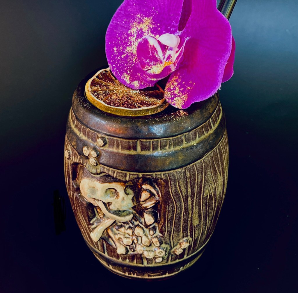 Combine all ingredients except garnishes in a blender or drink mixer with 1 cup crushed ice. Flash blend for about 5-10 seconds, then pour entire contents into barrel mug. Garnish with an orchid and dried lime wheel, then sprinkle a little edible glitter (hello, Pixie Dust!).