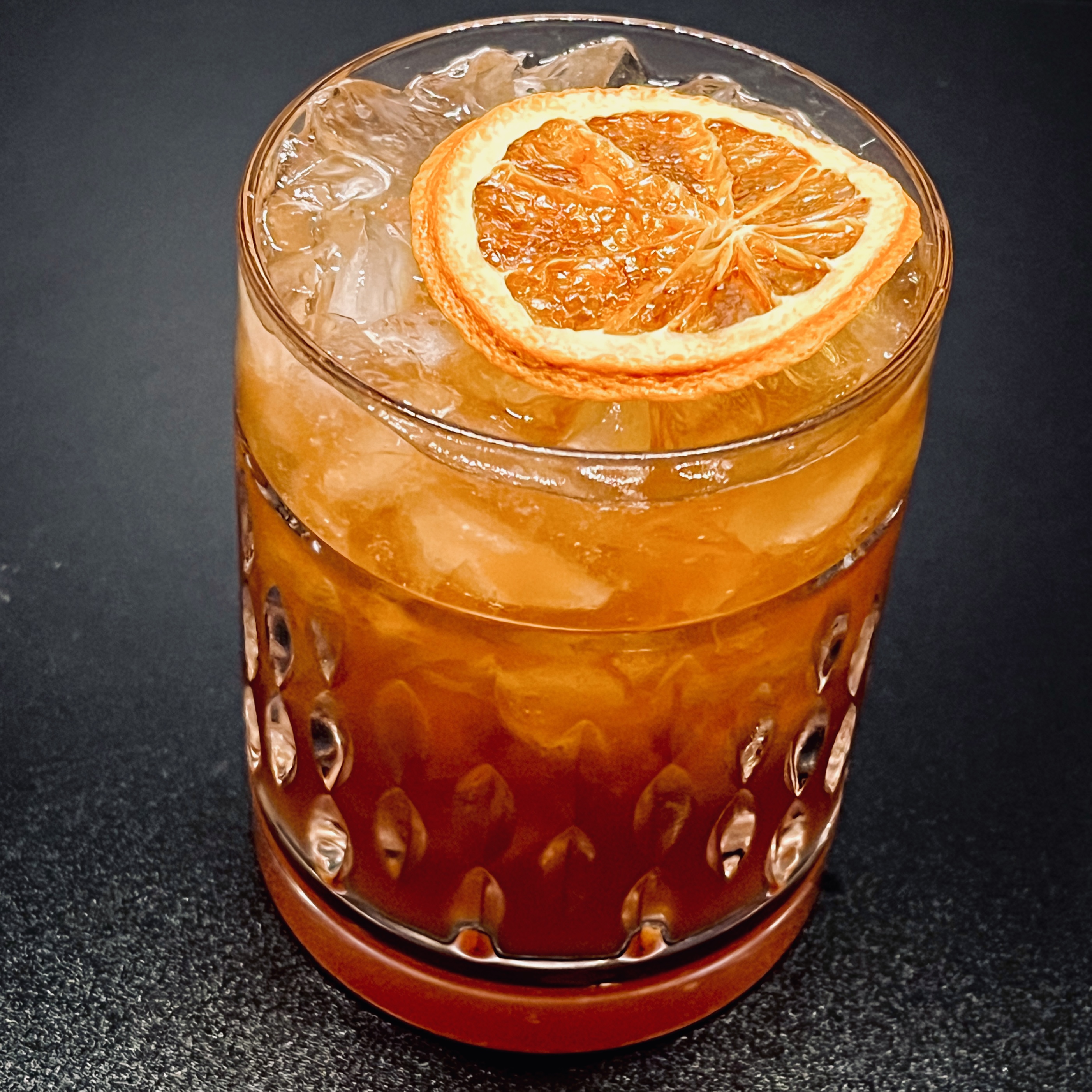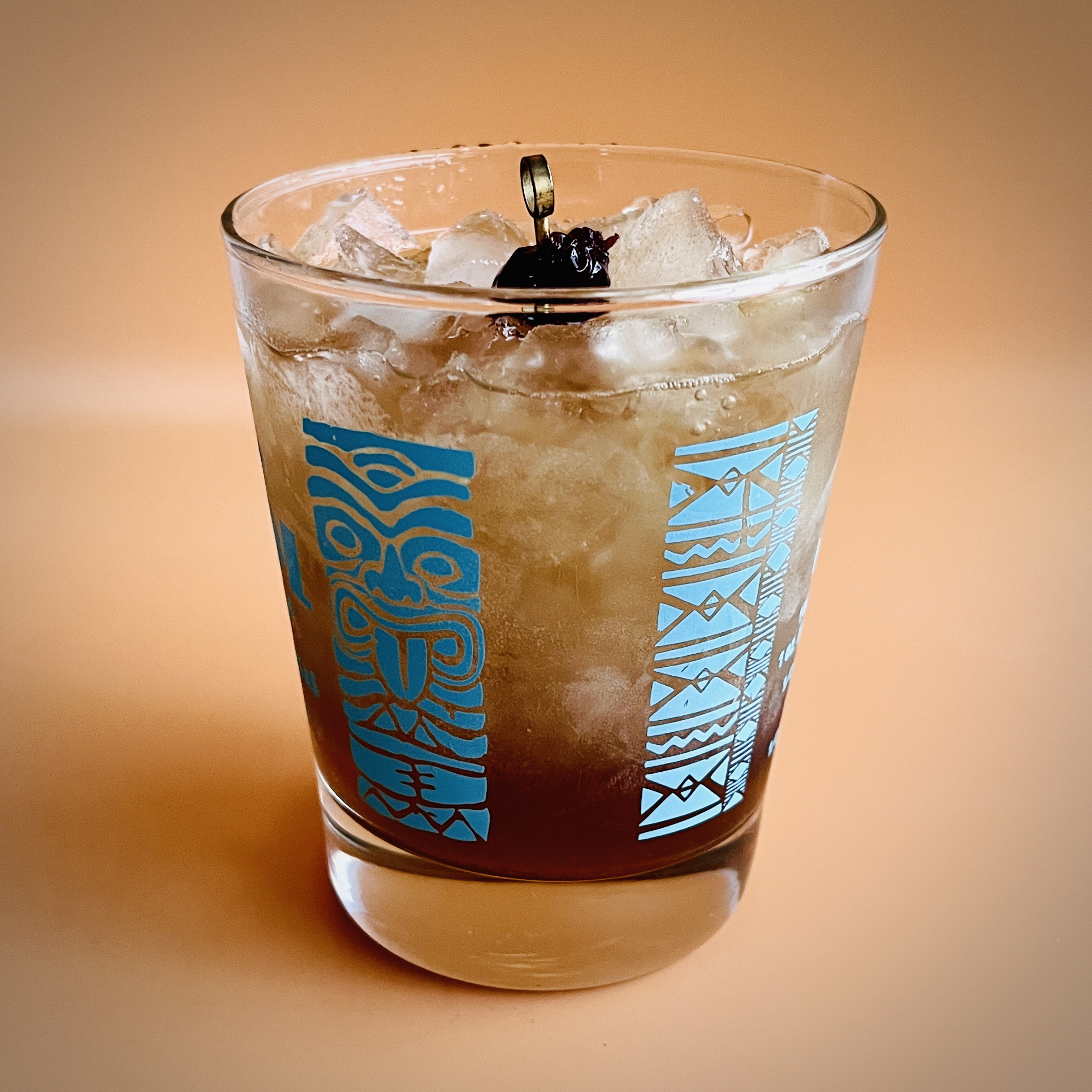 Combine ingredients in a blender with a cup of ice. Blend for about five seconds, until the ice is crushed but not liquefied. Pour into rocks glass, add more crushed ice if needed, and garnish with a maraschino cherry.
