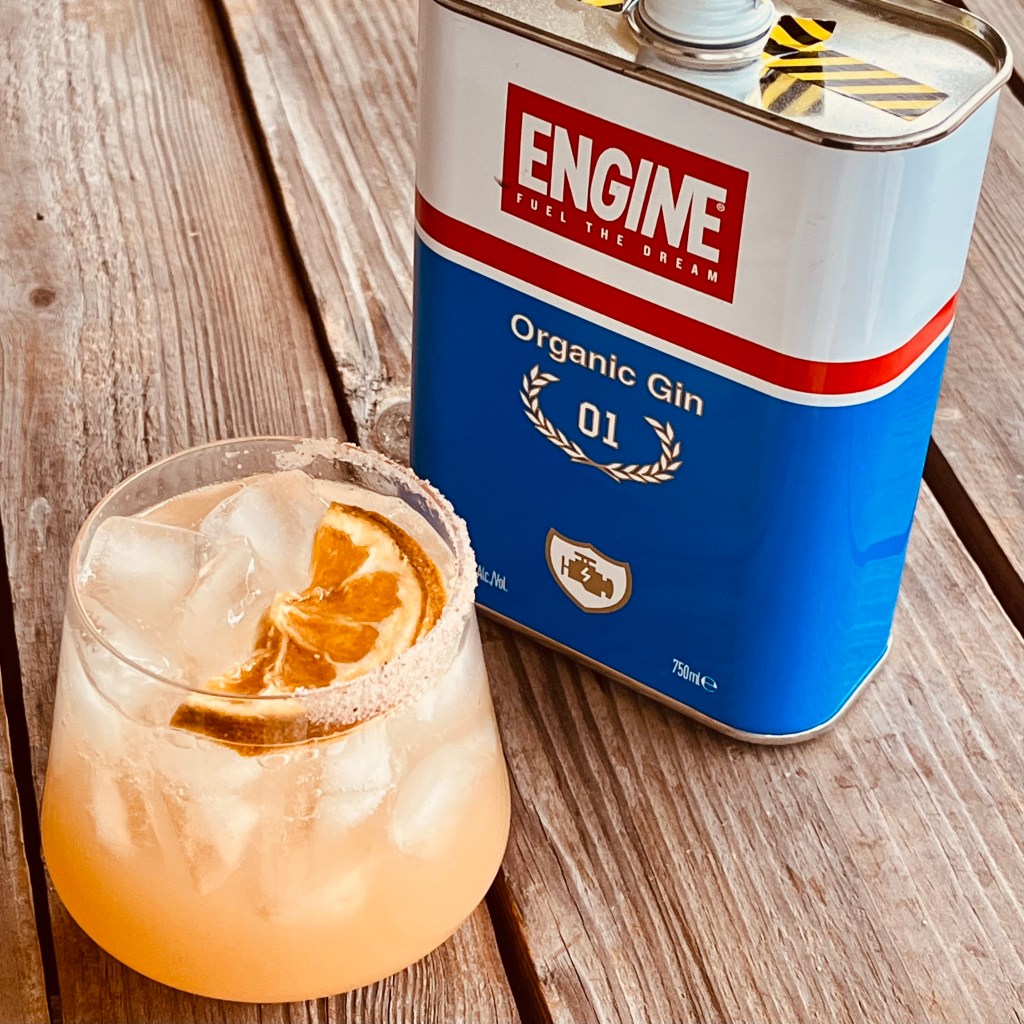 My cocktail this week is inspired by some motor oil-themed gin I was gifted recently, cleverly titled “Engine”. Check out that fun container! While watching The World’s Fastest Indian, conjure the flavor of the Bonneville salt flats with this Salted Gin Paloma.