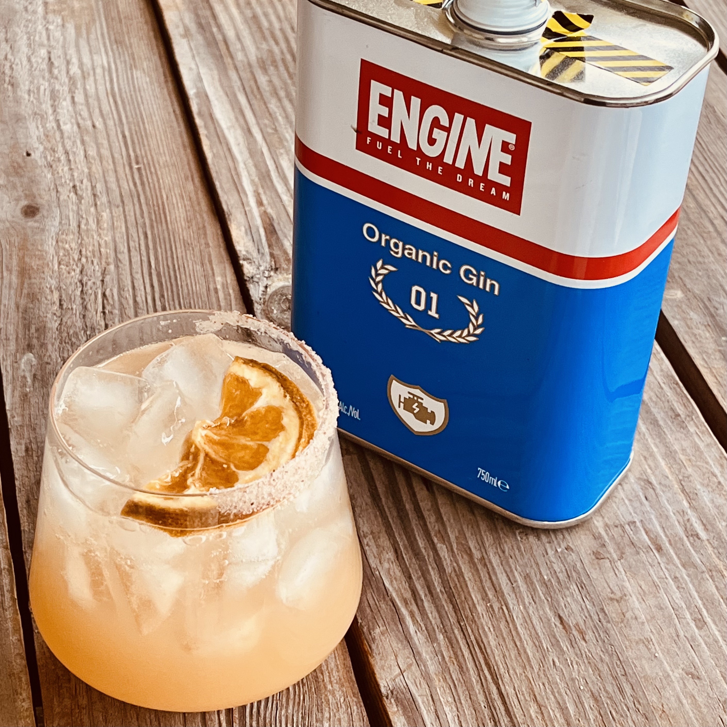 My cocktail this week is inspired by some motor oil-themed gin I was gifted recently, cleverly titled “Engine”. Check out that fun container! While watching The World’s Fastest Indian, conjure the flavor of the Bonneville salt flats with this Salted Gin Paloma.