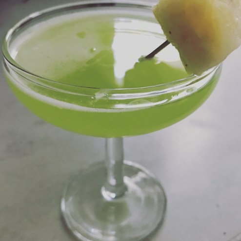 Shake well over ice to chill, then strain into a martini glass. Garnish with pineapple chunk.