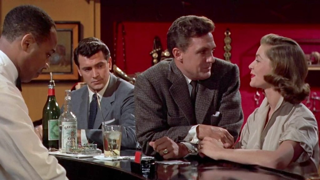 Written on the Wind is a natural fit for Cinema Sips because somebody is holding a cocktail in nearly every scene. Robert Stack and Dorothy Malone play spoiled boozehound siblings, while Rock Hudson and Lauren Bacall try to temper the siblings’ wild ways. Rock loves Lauren, Lauren loves Robert, Dorothy loves Rock, Robert loves liquor, and this quadrangle is one delicious Texas soap opera. Rock is maybe the hottest geologist to ever set foot on an oil rig, and it’s easy to see how Dorothy Malone’s character Marylee could self destruct over her unrequited love for him. She has all the best scenes in the movie, leaning over cars and divans with a glass in her hand like the world bores her to death. But it’s all a front: she’s just a lonely girl who wants her brother’s best friend to view her as more than a kid sister. And in Rock’s case, she’ll be waiting forever.