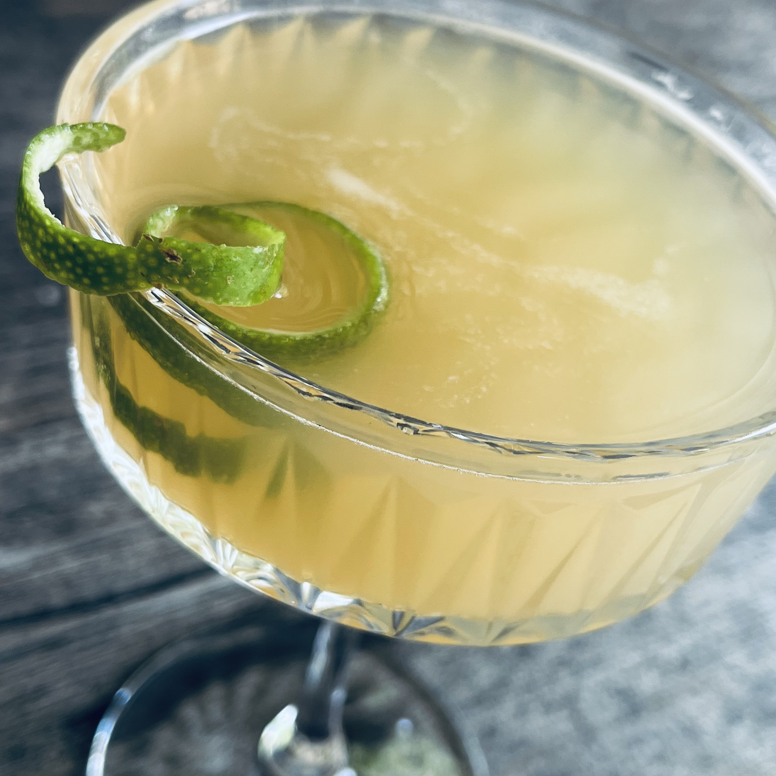 Build drink over ice, stirring to combine. Garnish with a dried lime wheel.