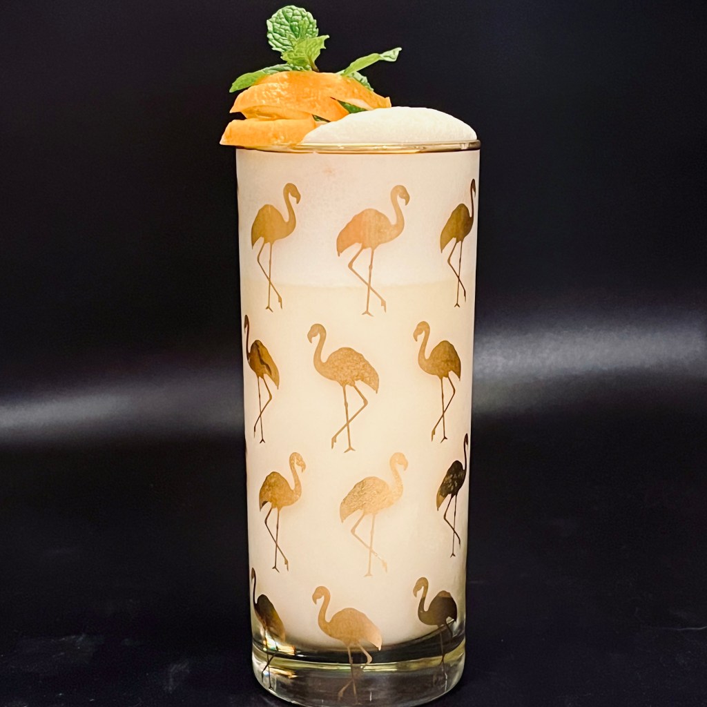 Combine all ingredients except soda water and garnish in a shaker with ice and shake until chilled. Strain into a glass, then pour back into the shaker to “dry shake” without ice for another ten seconds, until frothy. Double strain the mixture into a chilled collins glass, and top with soda water. Garnish with fresh mint and orange twist.