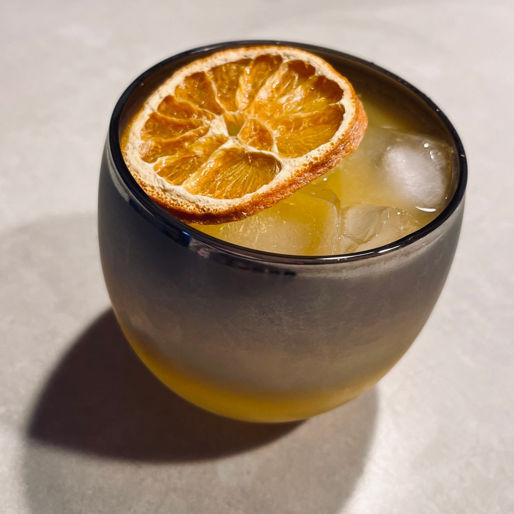 Combine all ingredients in a shaker with ice. Shake to chill, then strain into a glass filled with ice. Garnish with a dehydrated orange.